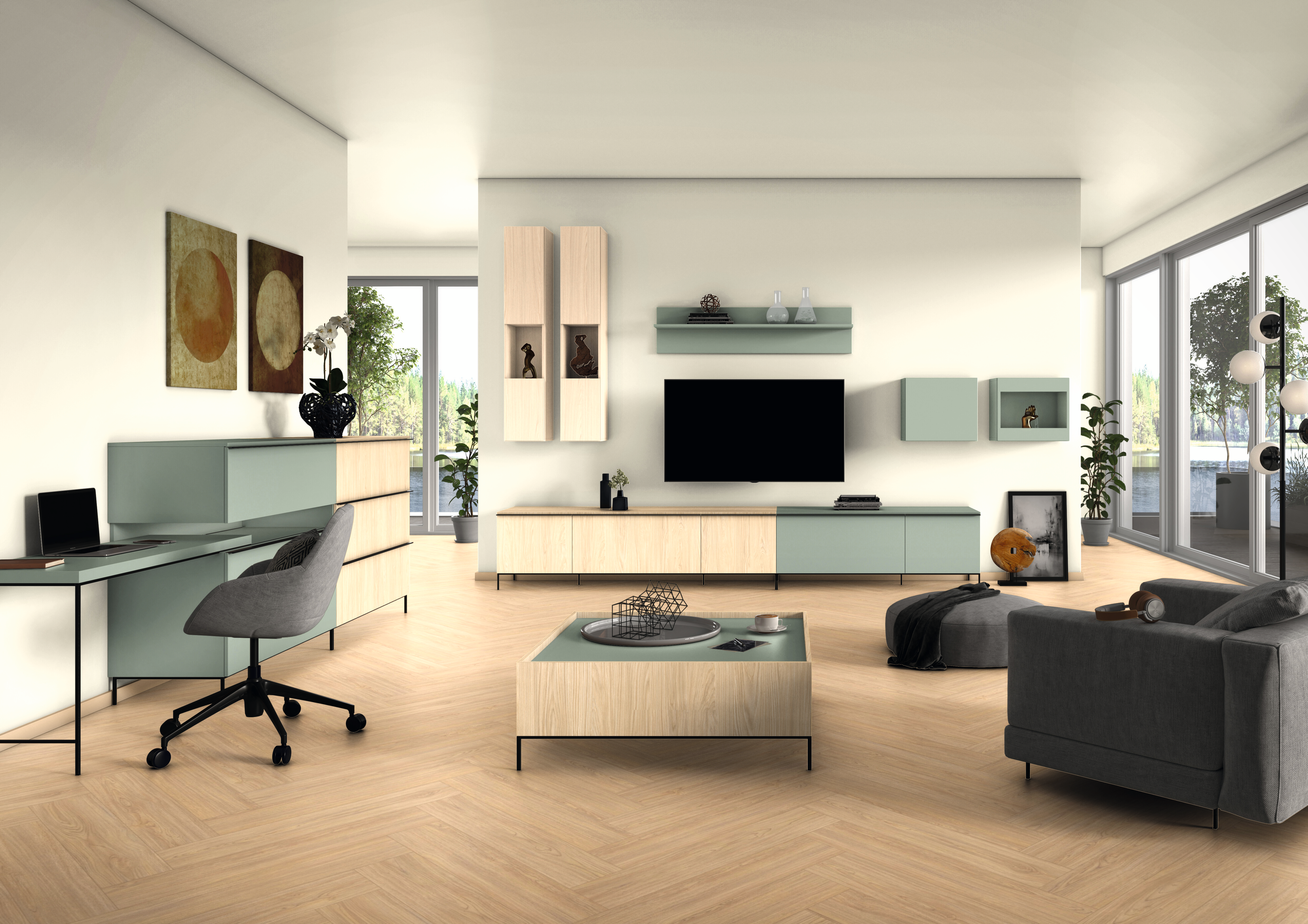 V takzvaném „biofilním designu“ jsou místnosti často navrženy s gradací mnoha tlumených zelených tónů, které v kombinaci s přírodními materiály odrážejí rozmanitost přírody. U604 Eukalyptově zelená je chladnější variantou těchto šedavých zelených barev, které mohou být v mnoha kombinacích nadčasovým prvkem. Ve spojení s dřevinami ve středních až tmavě hnědých přírodních tónech působí tato zelená barva velmi autenticky a elegantně; ve spojení se světlými dřevinami působí tato kombinace svěže a přirozeně. Povrchová struktura PM PerfectSense Premium Matt dodává tomuto uni odstínu mimořádně sametový, na dotek měkký charakter a jedinečný klid povrchu. Ochrana proti otiskům prstů zdokonaluje vzhled a dojem tohoto matného povrchu. Povrchy PM jsou vhodné i pro horizontální použití.