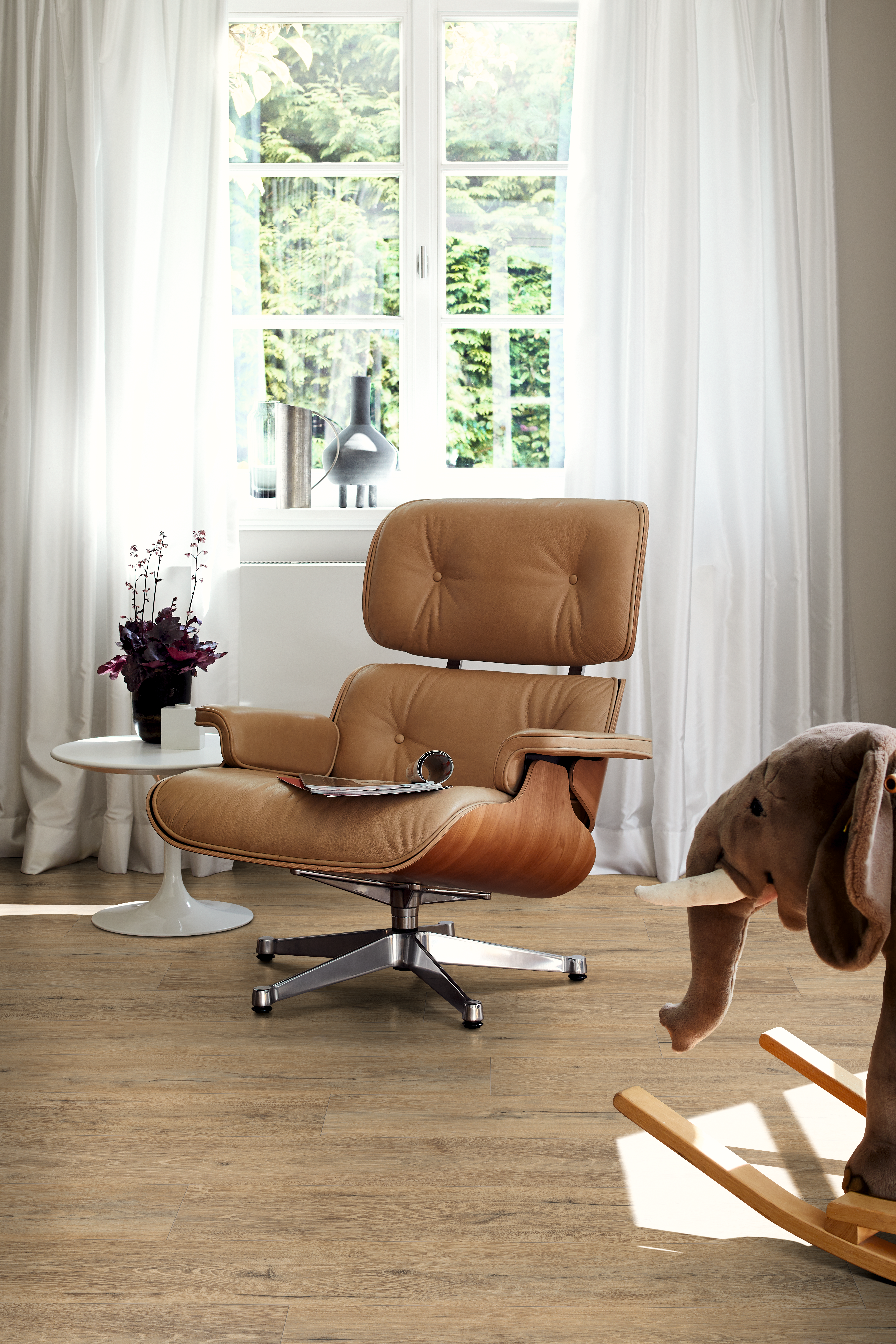 Natural Melba Oak is a very natural woodgrain decor of authentic appearance with slight cracks and sporadic prominent pores. The very natural brown tone creates a pleasant spatial image, in which the flooring surface generates a warm surface through brown, natural country house flooring boards.