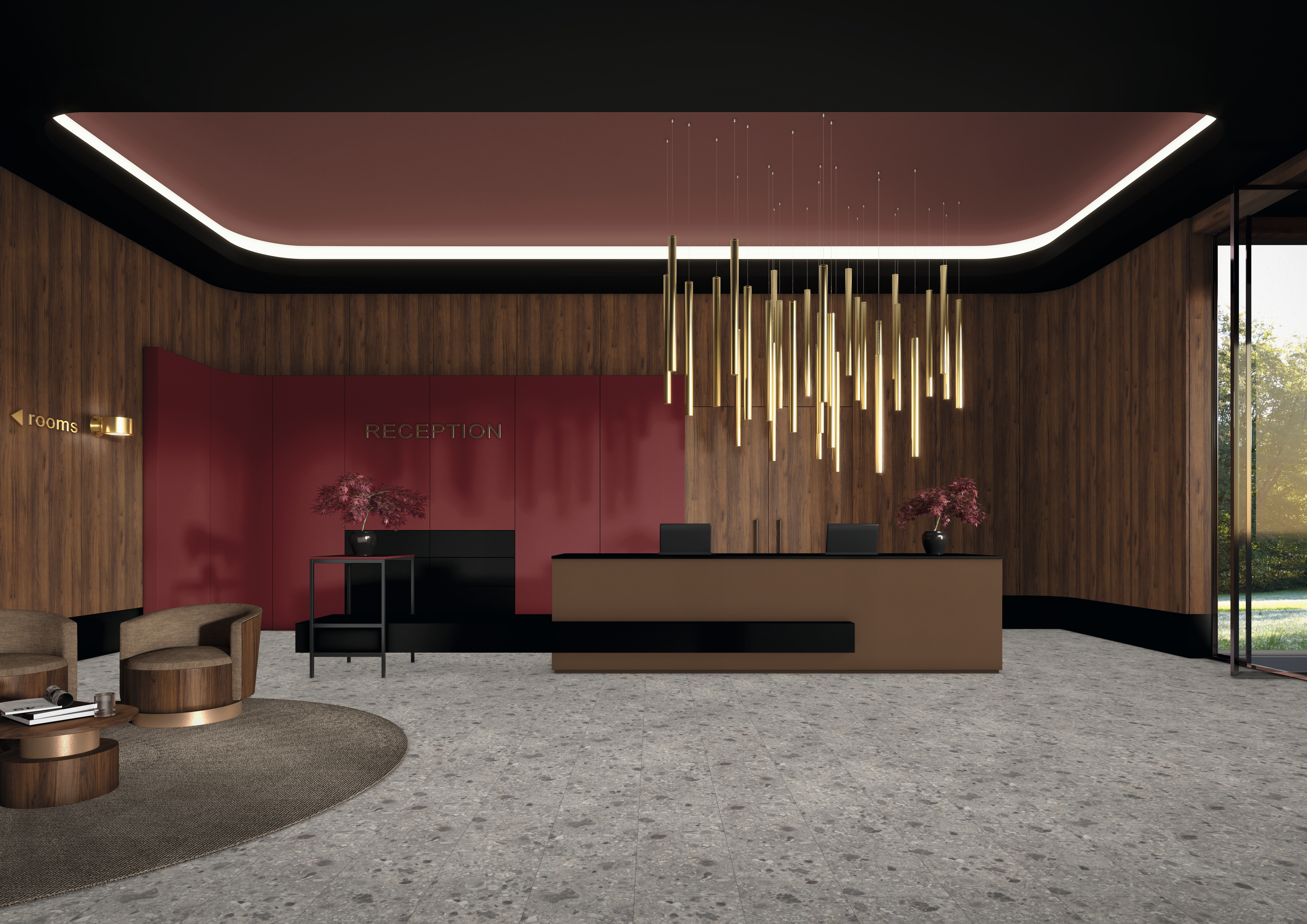 The U399 Garnet Red is a very deep dark red with a black content, which makes the interplay with almost black woodgrains and black itself appear very sophisticated. Such dark, muted colours create fluid combinations with natural warm looks. These optical properties are given the perfect haptic finish with the PM PerfectSense Premium Matt lacquer surface. The use of an MDF core material or laminate as the base material creates a particularly matt quality and a unique surface calm. The anti-fingerprint property opens up additional application possibilities for this matt uni surface, even on surfaces exposed to heavier stress.