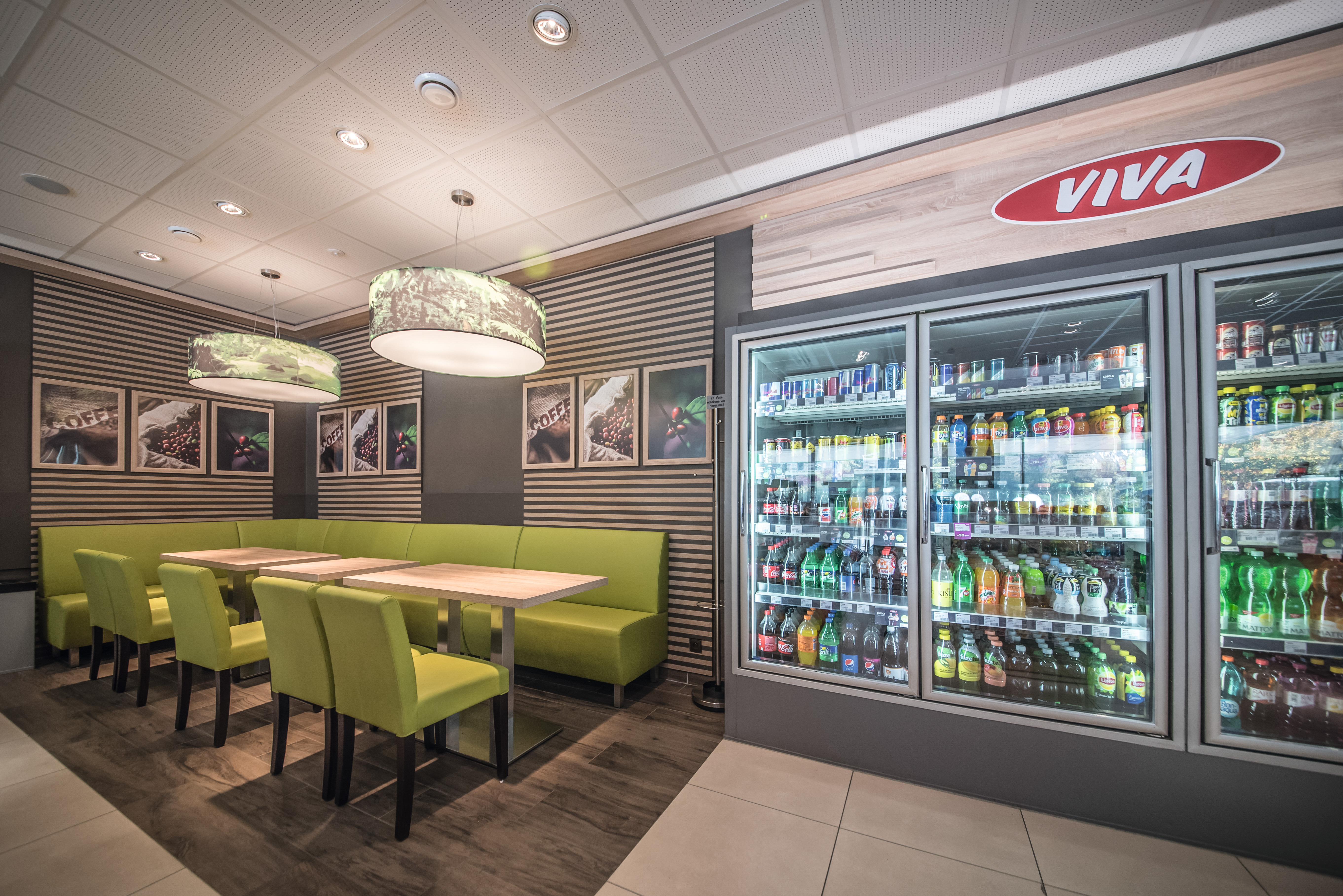 Combining modern grey and oak, the furniture helps to create a friendly atmosphere that welcomes every visitor to the OMV filling station.