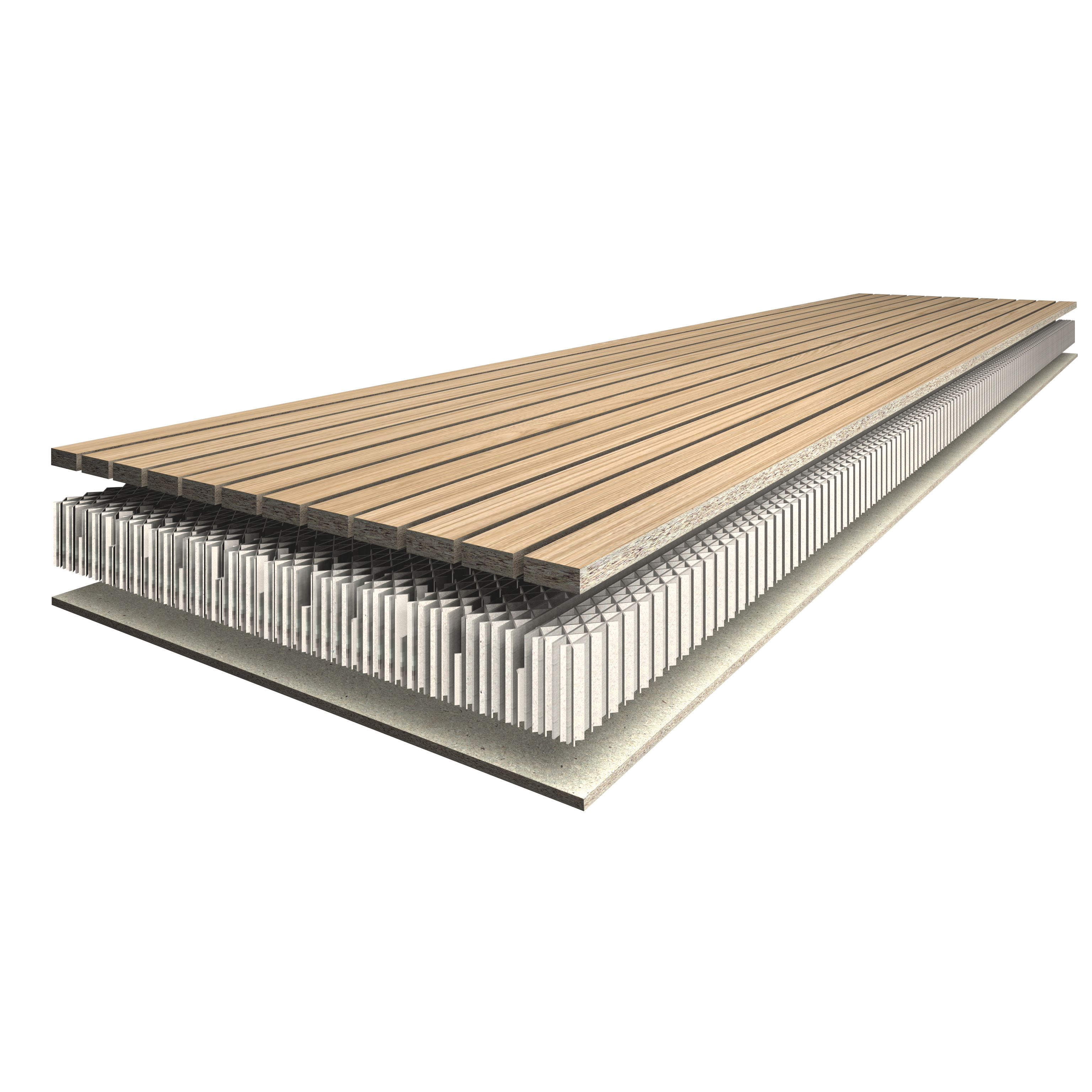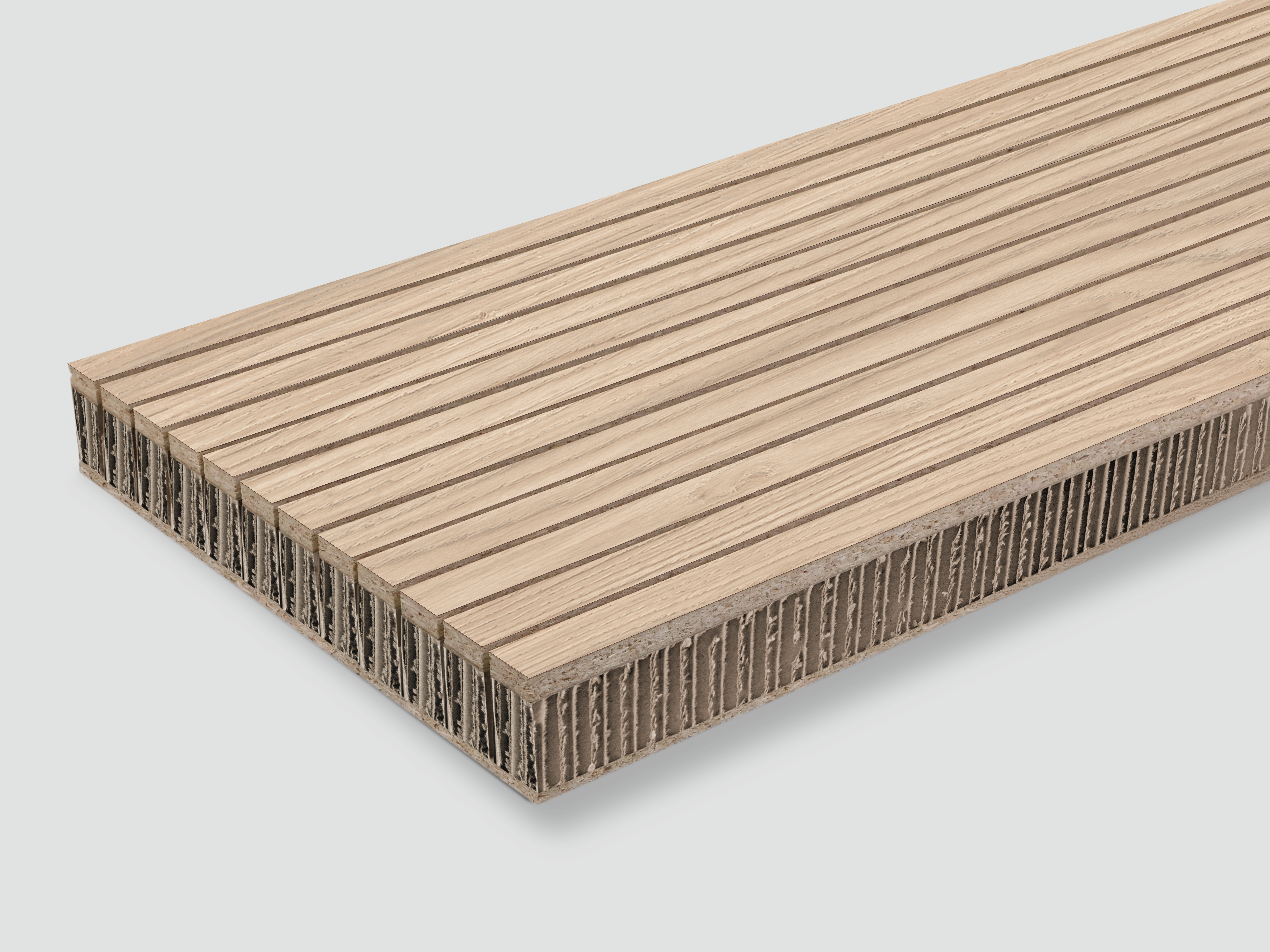 The EGGER Decorative Acoustic Panels are constructed as a composite board, similar to the EGGER Lightweight boards. The back consists of a 4 mm thick, raw, thin particleboard, and the middle layer of a 30 mm cardboard honeycomb core. The surface is made of 8 mm decorative particleboard. The panels measure 2,700 x 280 mm and are 42 mm thick. The surface is slatted along the length of the panel and the slots within a panel are designed in three different widths. In addition to the sound absorbing effect of the panel, the partially slatted back allows sound to penetrate the substructure and be absorbed. EGGER Decorative Acoustic Panels are available in the decors from the EGGER Decorative Collection.