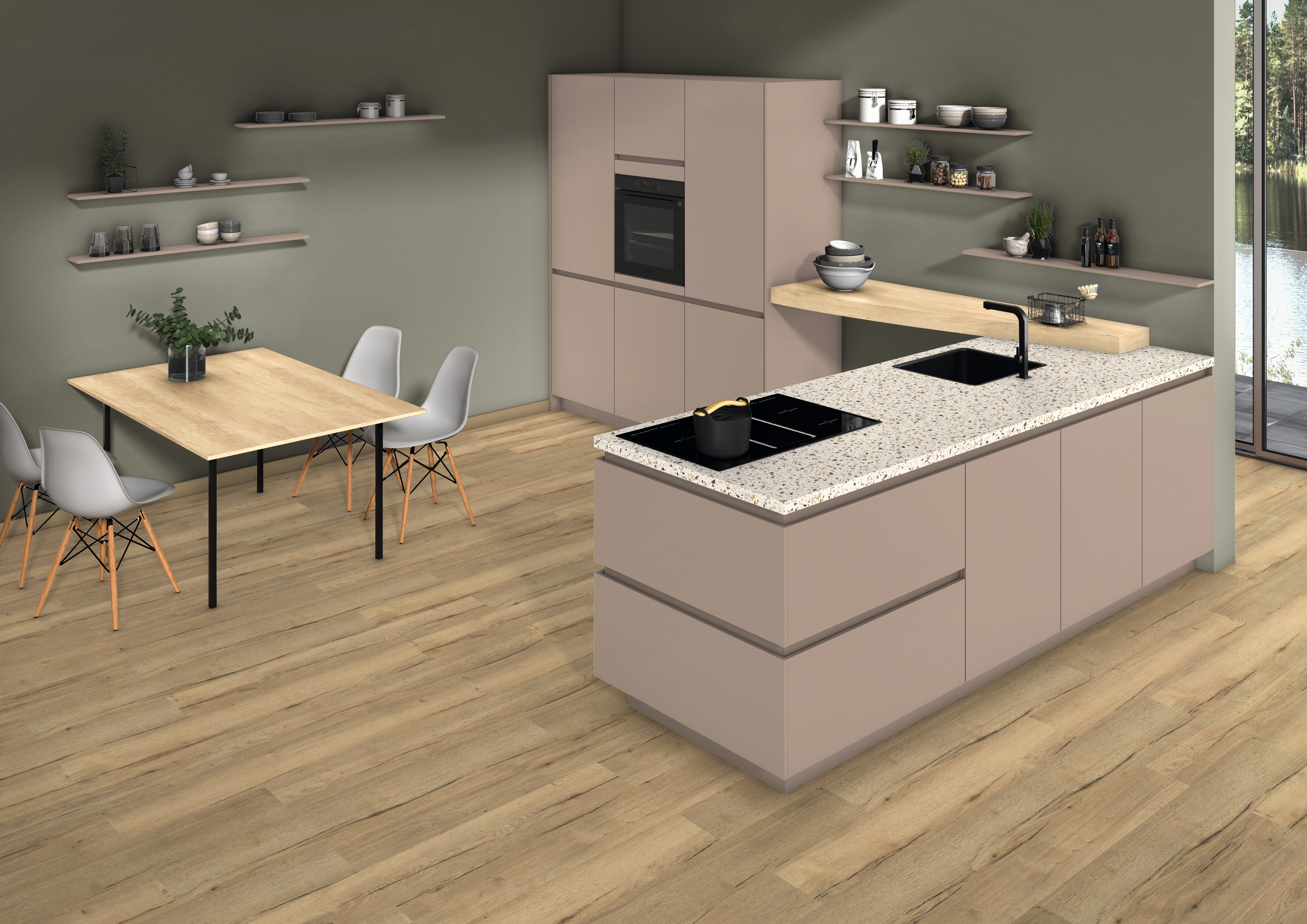 With new recycled materials, terrazzo is becoming ultra-modern again. This look is taken up by decor F004 Pelago Terrazzo. The terrazzo stones show a variety of warm tones on a warm white base. This means that many combinations are possible as cover boards with wood. The ST75 Mineral Satin surface texture gives the decor a calm velvety look and feel, characterised by small indentations in an overall homogeneous surface.